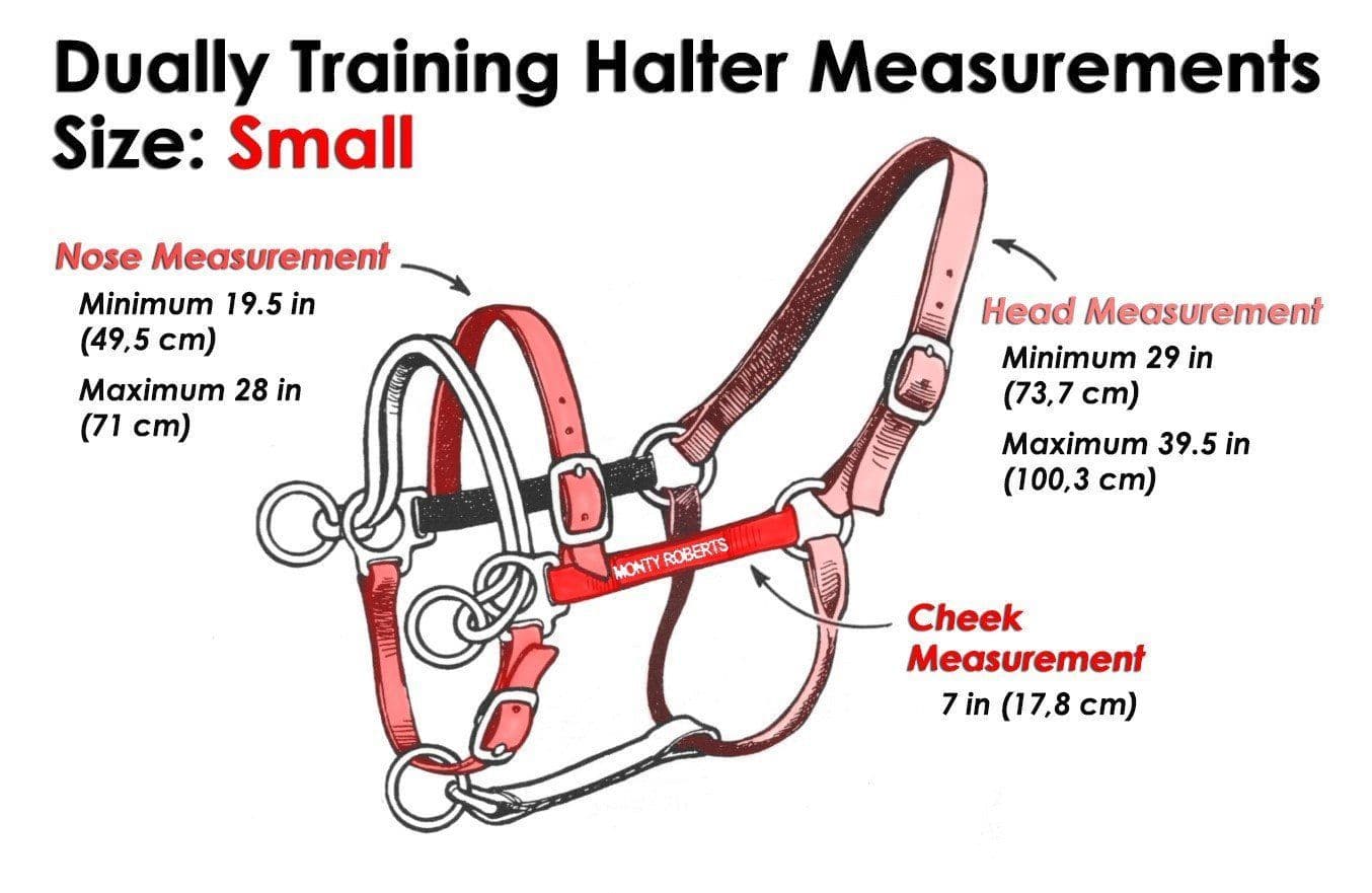 Home Product Description Monty Roberts Dually Halter The Monty Roberts Dually Halter is an innovative, patented solution designed to enhance the partnership between horse, handler, and halter. This halter encourages horses to respond naturally to gentle pressure from its soft, round noseband, moving both forward and backward without experiencing pain, knots, or poll pressure. Key Features: Natural Pressure Response: Horses instinctively learn to respond to gentle pressure, aiding communication and training. Comfortable design ensures a stress-free experience, allowing horses to find their “sweet spot” easily. Comprehensive Kit: Includes an instructional DVD and booklet, originally patented as dual-purpose equipment for leading and horse-friendly lunging or long-lining. Training Versatility: Recognized by trainers as invaluable in teaching tasks such as trailer loading, standing still, and functioning as a bit-less bridle for tack riding. Design and Fit: Adjustable Structure: Features an adjustable double noseband and left and right-side training rings, facilitating training in Monty’s natural horsemanship Join-Up® method. Offers three points of adjustment for precise sizing across a diverse range of horse sizes—from mini horses to draft horses. Dual Functionality: Adaptable as a standard headcollar for tie-up usage when utilizing the fixed ring under the chin. Not recommended for use during turnout to ensure maximum safety. Durability and Safety: Constructed with high-quality brass hardware designed to break away under extreme pressure. Made with double-stitched nylon, ensuring maximum durability. Small (Red) Dually Measurements: Nose: Minimum: 19.5 inches (49.5 cm) Maximum: 31 inches (78.7 cm) Head: Minimum: 29 inches (73.7 cm) Maximum: 39.5 inches (100.3 cm) Cheek (Ring to Ring): 7 inches (17.8 cm) The small size in red is ideal for ponies measuring 13 hands high (HH) up to 15.2 HH with smaller head proportions, offering a precise fit for effective training and comfort. Specifications Size Small MPN 663161500101 Make Monty Roberts SKU hred Name Monty Roberts Small Dually Halter Delivery & Returns 14 days refund | customer pays for return postage Please contact us to arrange a return Monty Roberts Dually Halter Small Red Nylon Headcollar Out of stock Monty Roberts Patented Schooling Halter £49.99 £41.66 (ex. VAT) Sorry, this item is out of stock You may also like Out of stock Monty Roberts Snaffle Bit: 5" Thin Out of stock